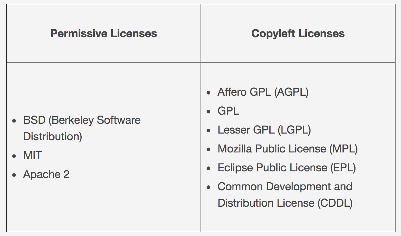 The first OSS license: BSD (Berkeley Software Distribution) A permissive software license, sometimes also called BSD-like or BSD-style license, is a free software software license with minimal requirements about how the software can be redistributed. Copyleft (a play on the word copyright) is the practice of offering people the right to freely distribute copies and modified versions of a work with the stipulation that the same rights be preserved in derivative works down the line.